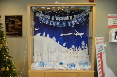 For the second year in a row we’ve have the pleasure of decorating the display case at City Hall. This time last year the staff at JB, our customers and passerby’s were overjoyed to see the whimsical “Santa’s Print Shop” display. It was filled with bright colours, textures, print samples and classic Christmas magic!